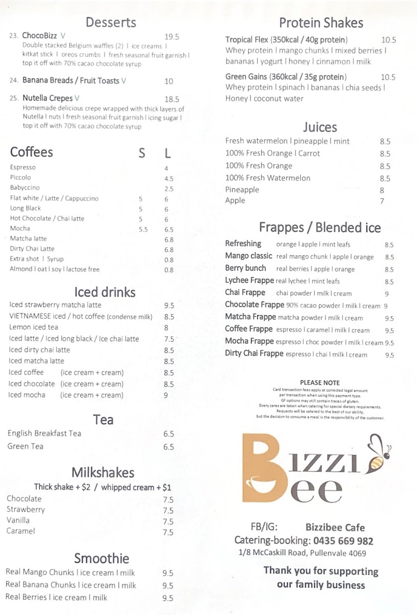 BizziBee Cafe offers a delightful menu that caters to everyone's cravings, whether you're stopping by for a hearty breakfast or a light lunch. The All Day Breakfast features sumptuous favorites like fluffy pancakes drizzled with maple syrup and classic eggs Benedict, perfect for those lazy weekend mornings. If lunch is on your mind, their All Day Lunch menu includes a range of delicious options to satisfy any palate. A customer favorite, the Lunch Favourite, is a true testament to the cafe's dedication to quality and flavor.